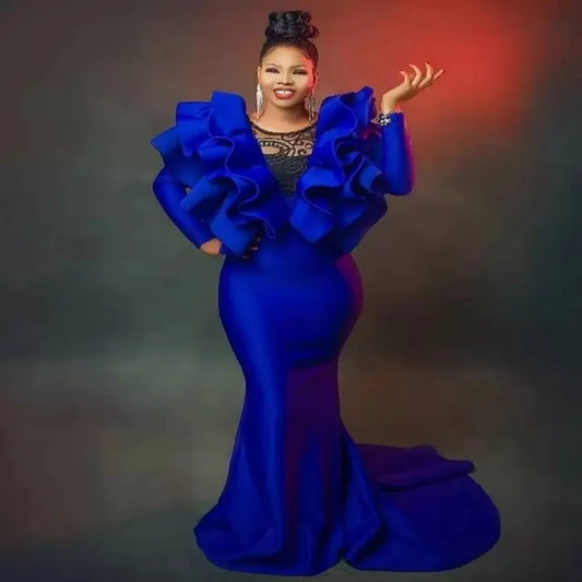 Plus Size Royal Blue Mermaid Prom Dresses Lace Long Sleeves Ruffles Satin Evening Formal Party Gowns