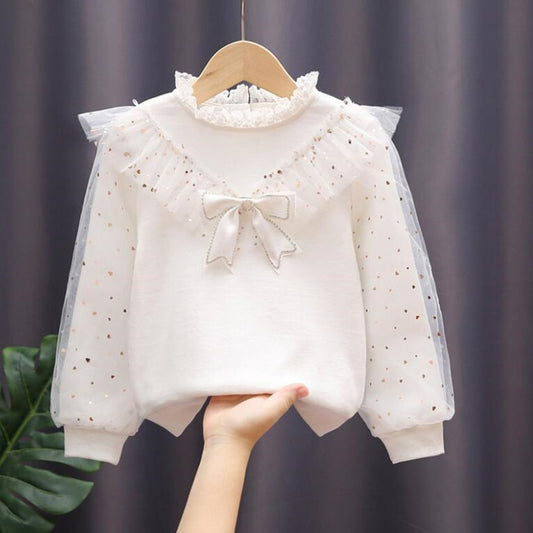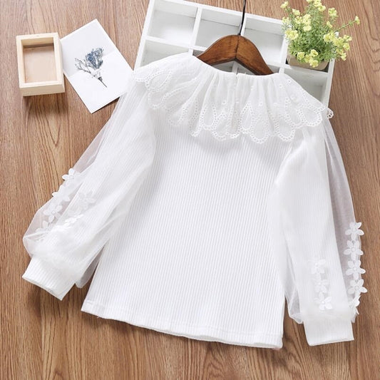 White Lace Puff Long Sleeve Blouse Top for Girls
