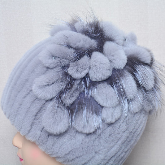 Fur Flowers Hat Winter Warm Handmade Beanies