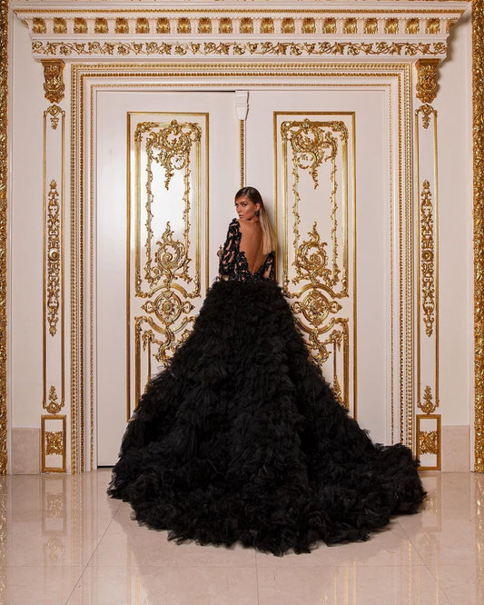 New Trend Black Fluffy Tiered Long Women Dress To Party Straight Layered