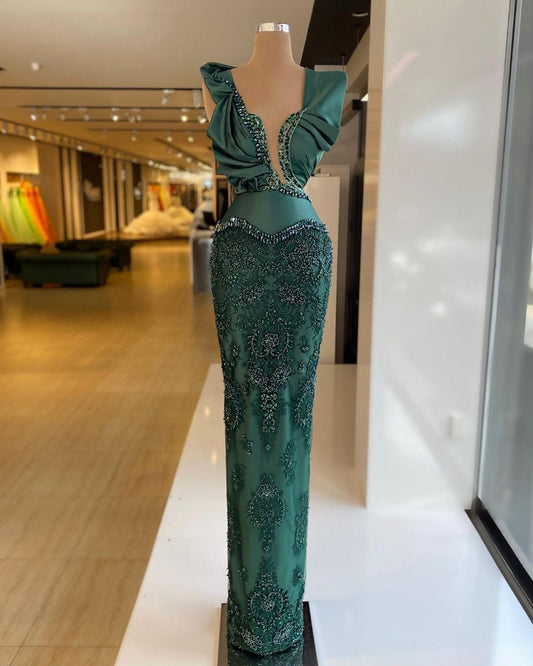 Green Beaded Mermaid Evening V neck Custom Made Crystal Sequin Party Prom Dress