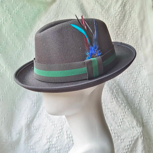 Men’s European & American Fedora – Small Top Winter Hat in Thickened Golden Velvet with Feather, Flipped Brim “Hamburger” Style