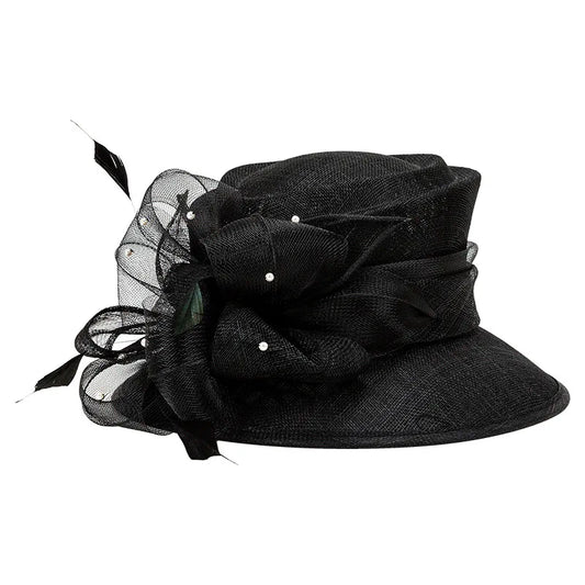 Elegant Court Sinamay Linen Wide Brim Hat for Women – Wedding, Church, Kentucky Derby & Party Fedora with Floral Detail, Ladies Formal Summer Headwear