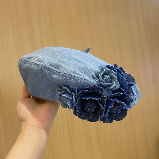 Ladies Denim Beret Hat – Vintage Retro Painter Cap with Floral Design, Casual Cowboy Style Luxury Spring & Autumn Hat for Women