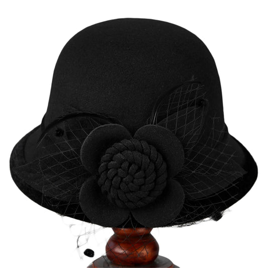 Women’s Wide Brim Bowler Hat – Vintage Church Hat with Mesh & Flowers, Elegant Accessory for Fancy Dress & Costumes