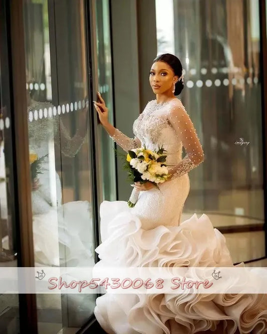 Luxury Tiered Skirts Mermaid Wedding Dresses Chic Long Sleeve Pearls Long Train O Neck Bridal