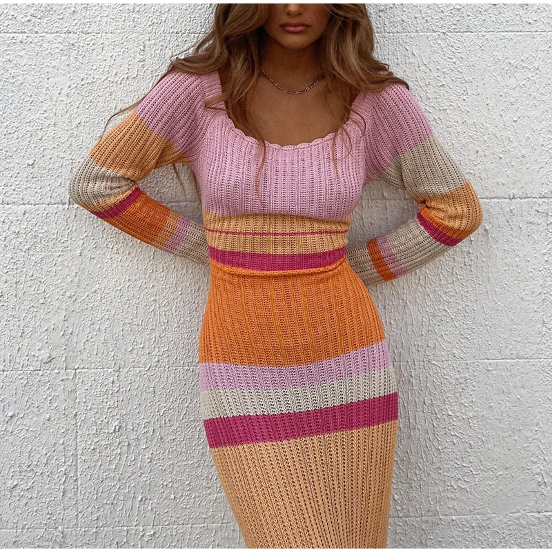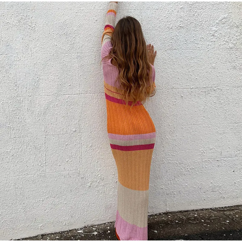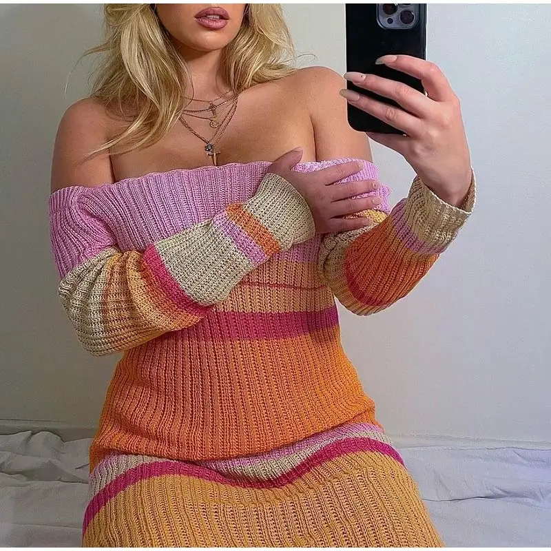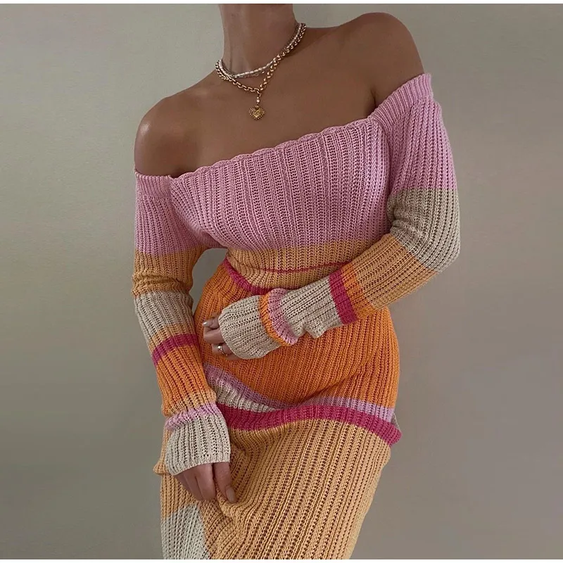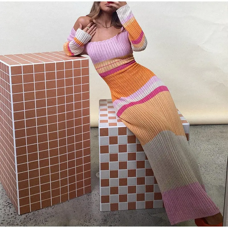 Sexy Off Shoulder Stripes Knitted Maxi Dress